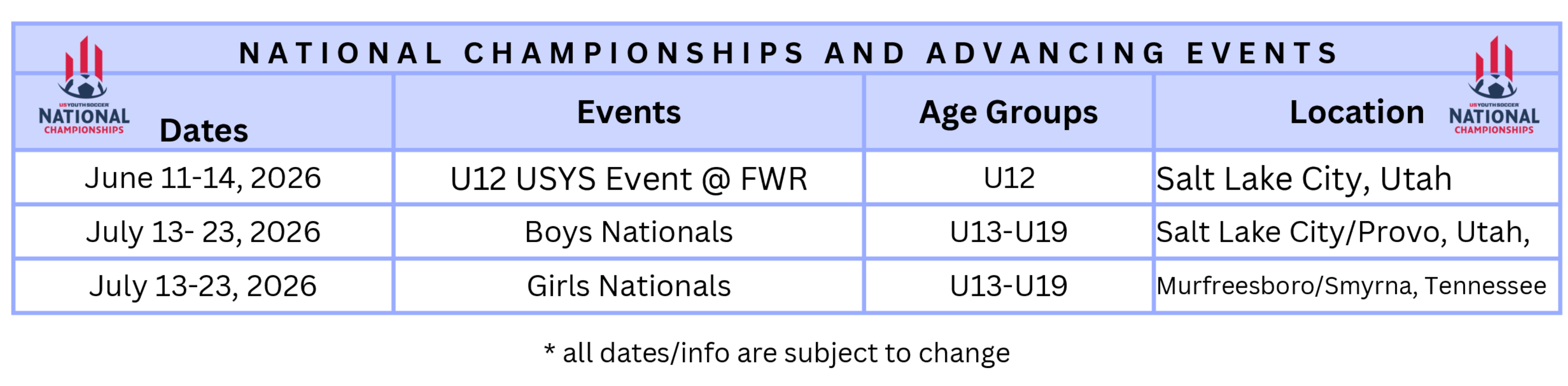 U13-U18/19 teams that opt in to the USYS National Championships (July 13-23, 2026) at registration and win State Cup will automatically advance to the event.